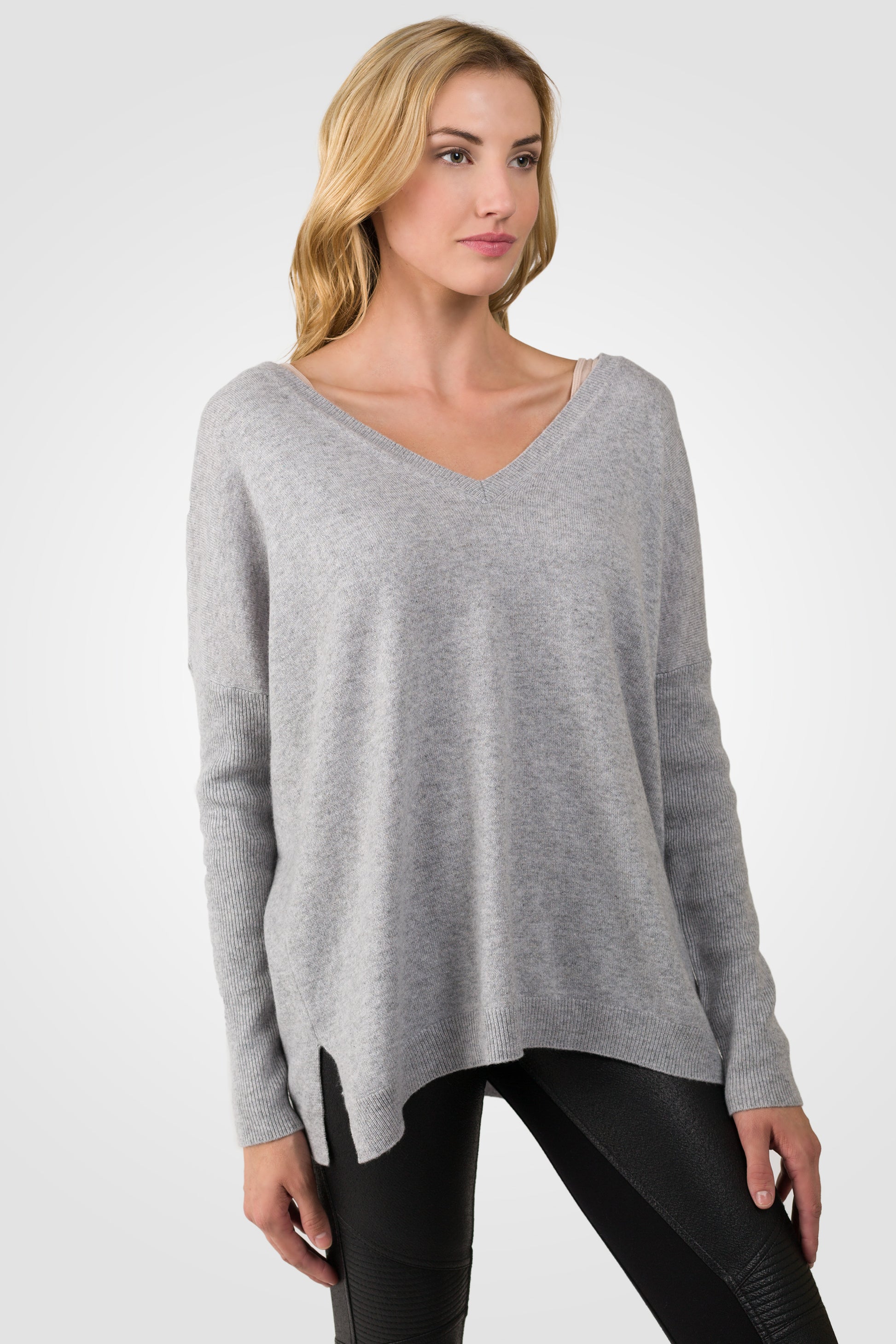A relaxed slouchy silhouette defines this ultra-soft Cashmere Oversized Double V Dolman Sweater. Crafted from only the finest cashmere, this simple classic incorporates contemporary sophistication with its long dolman sleeves for a chic look appropriate in all settings.
