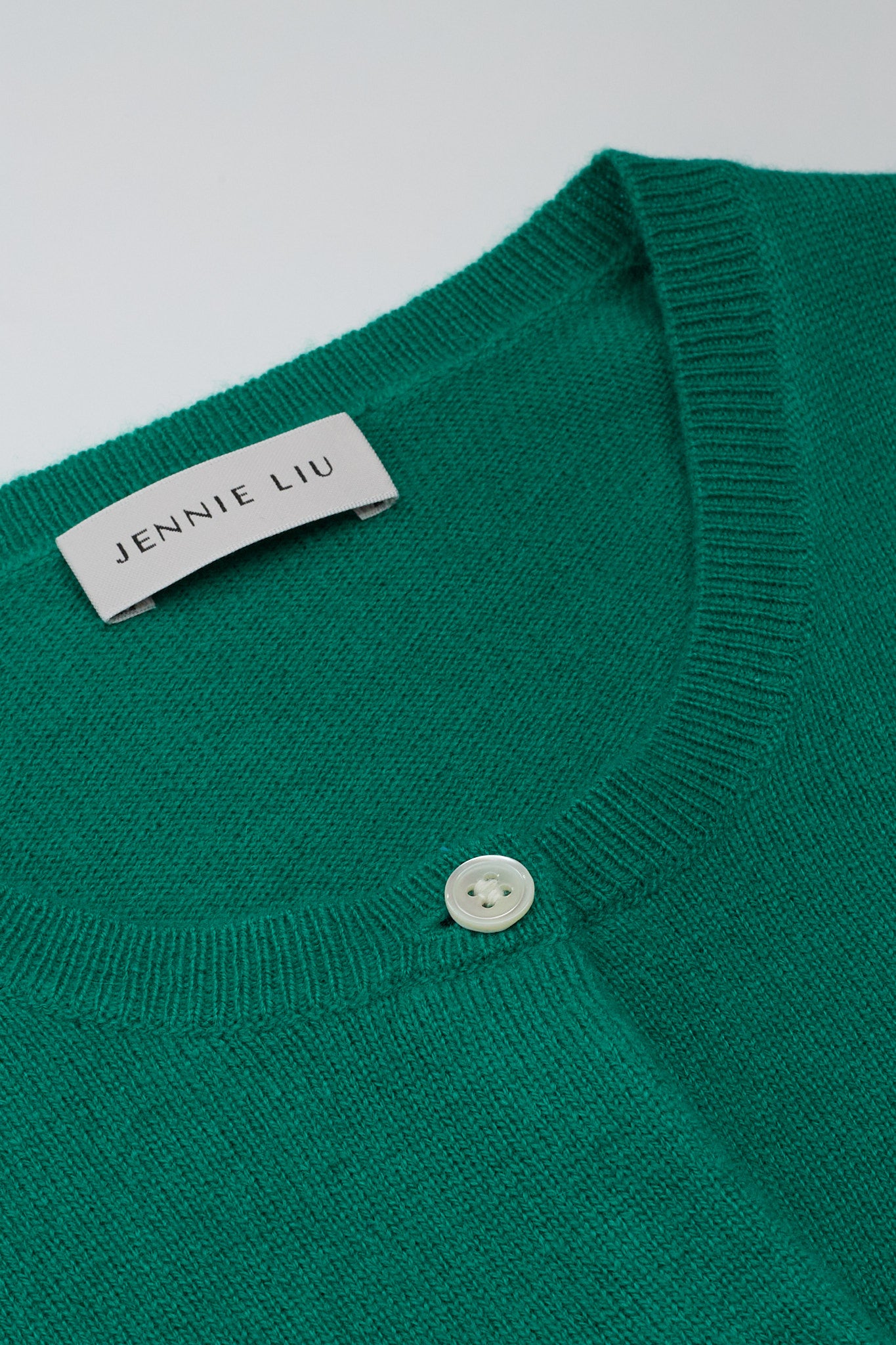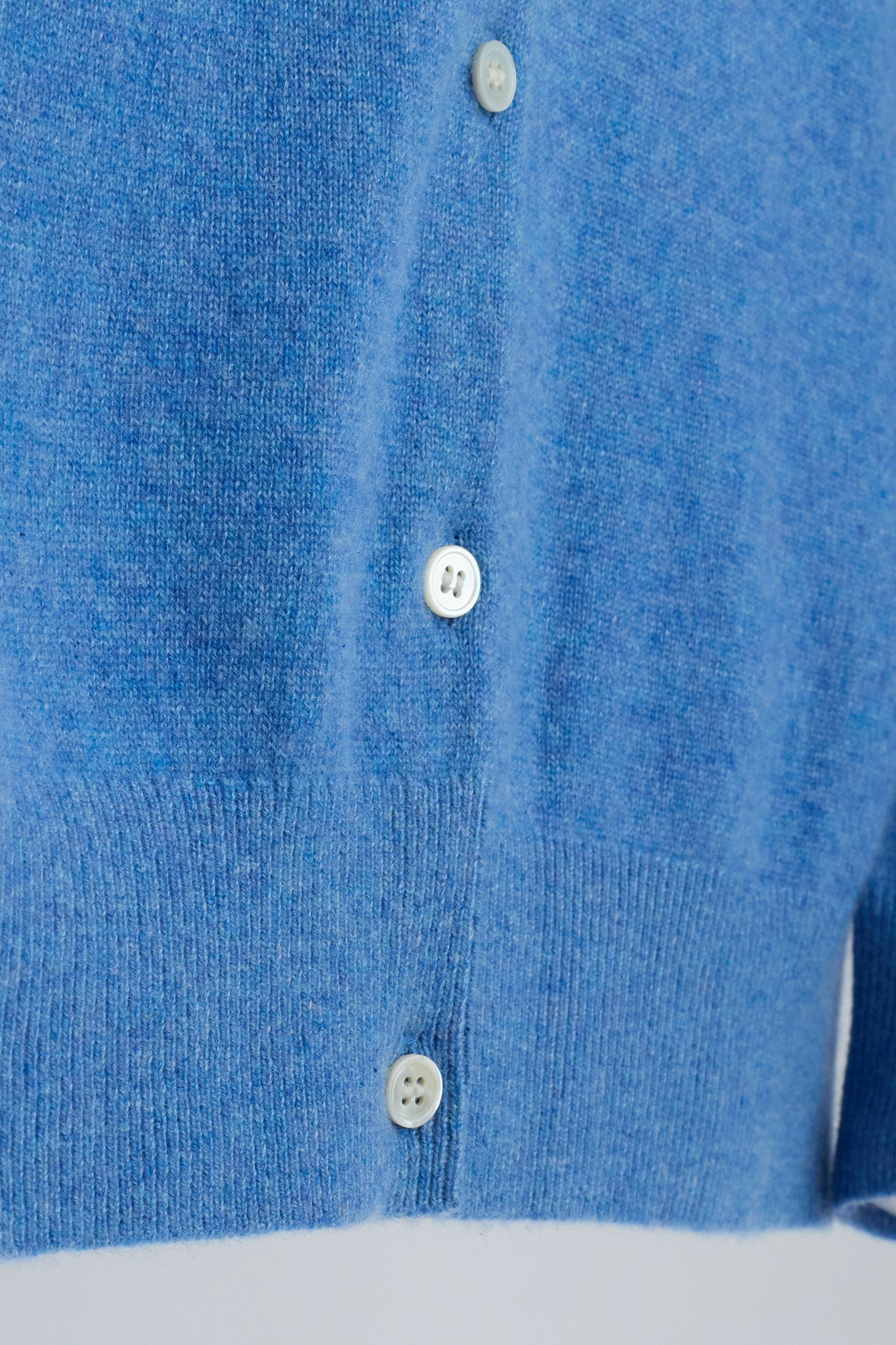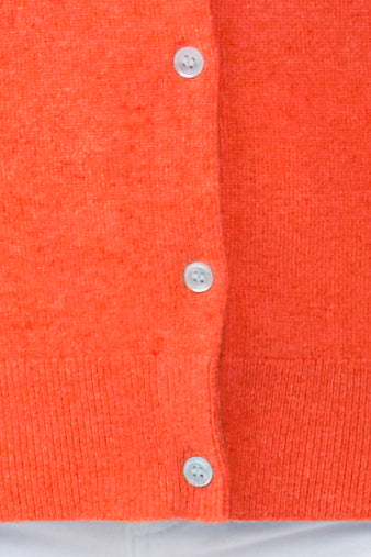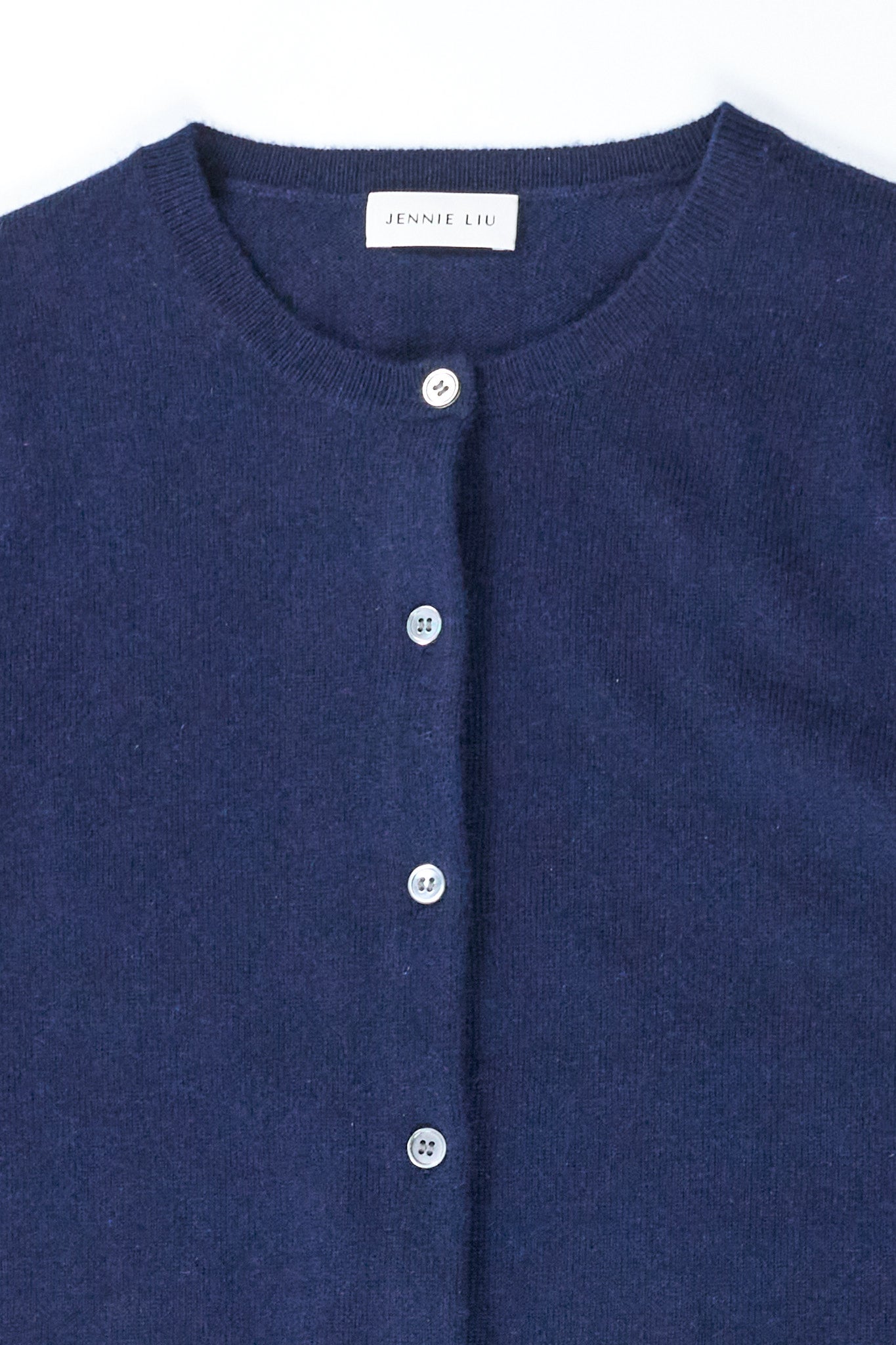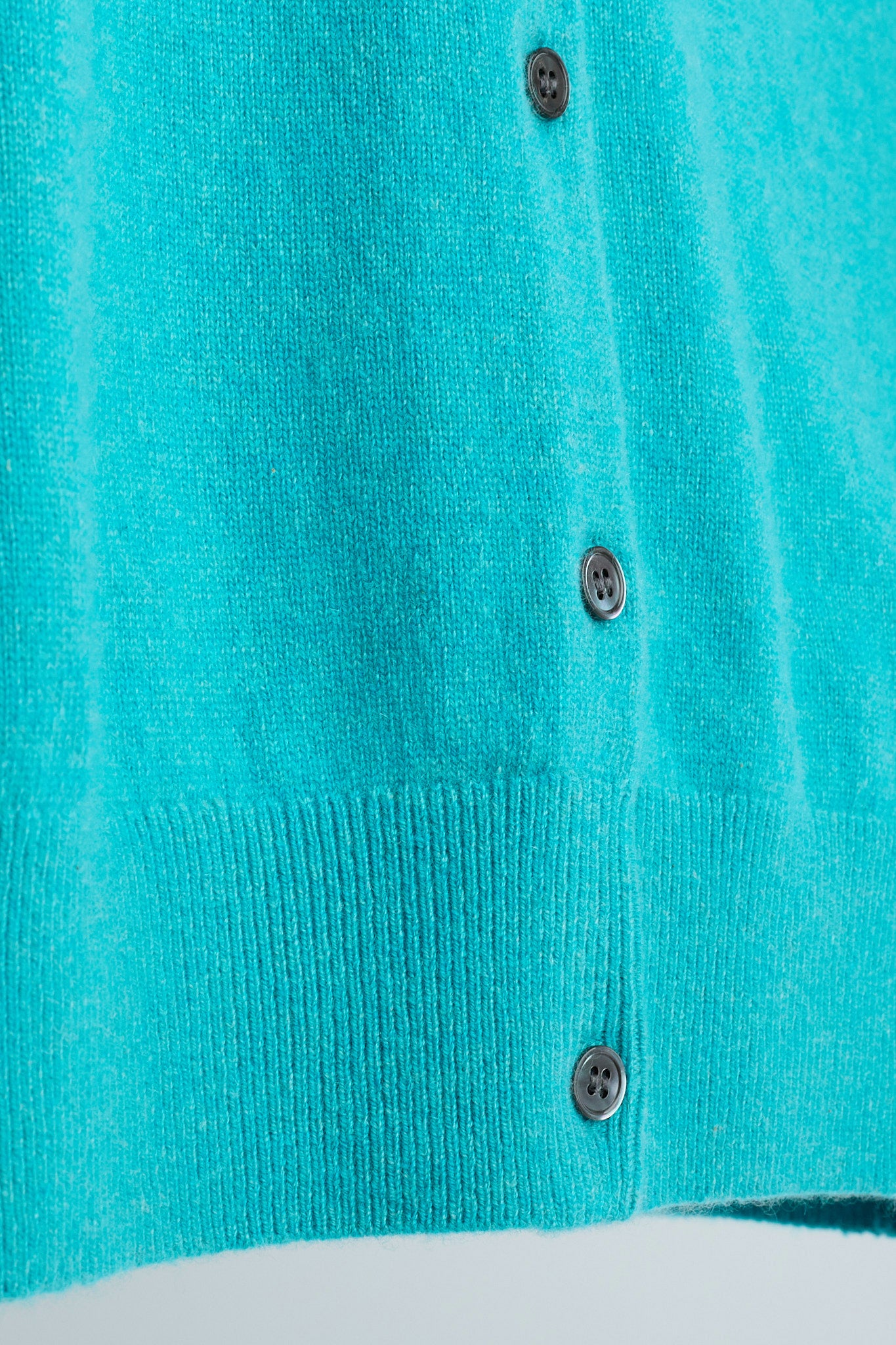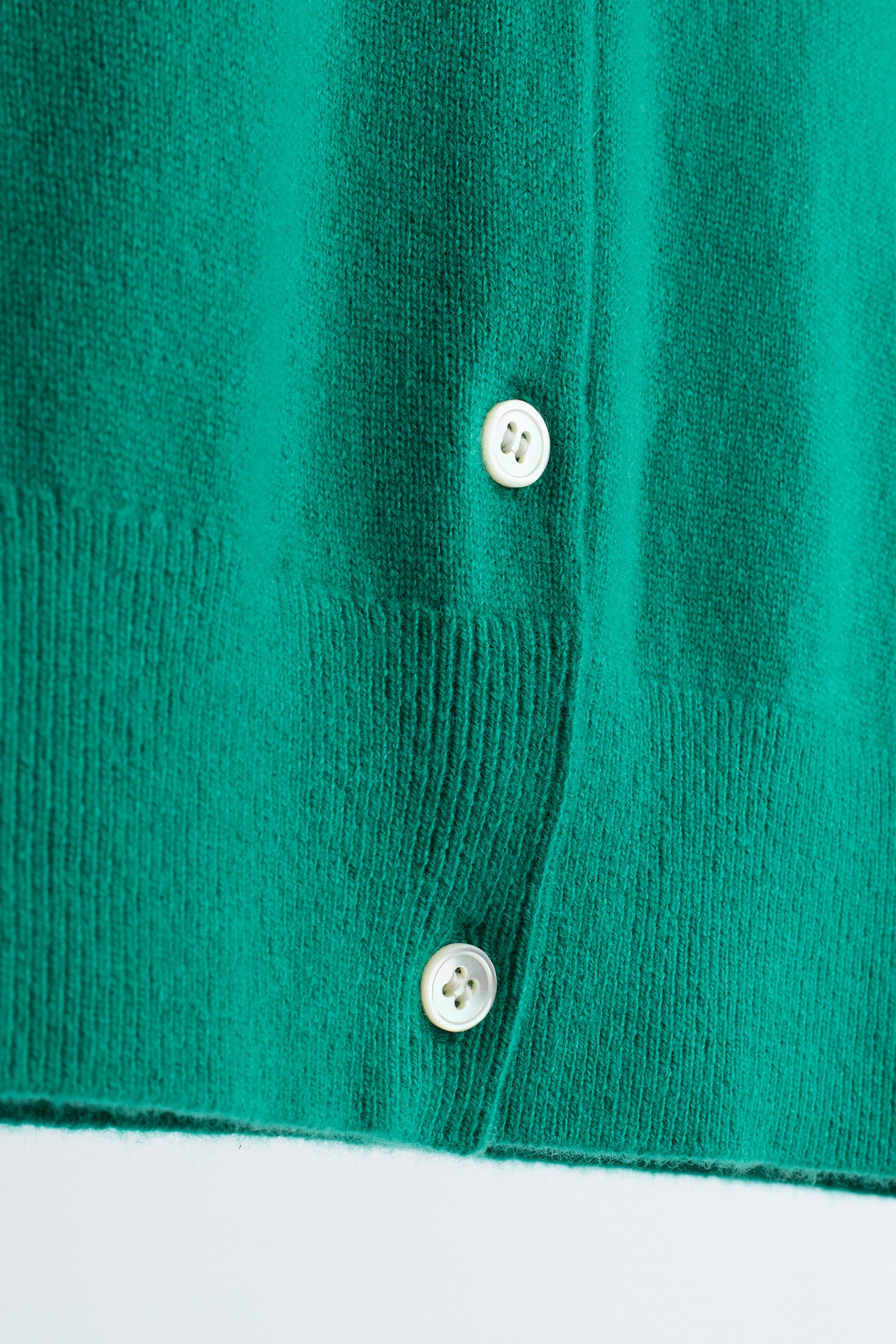 First quality premium cashmere cardigan sweater with shell button front closure on clean self-facing placket.