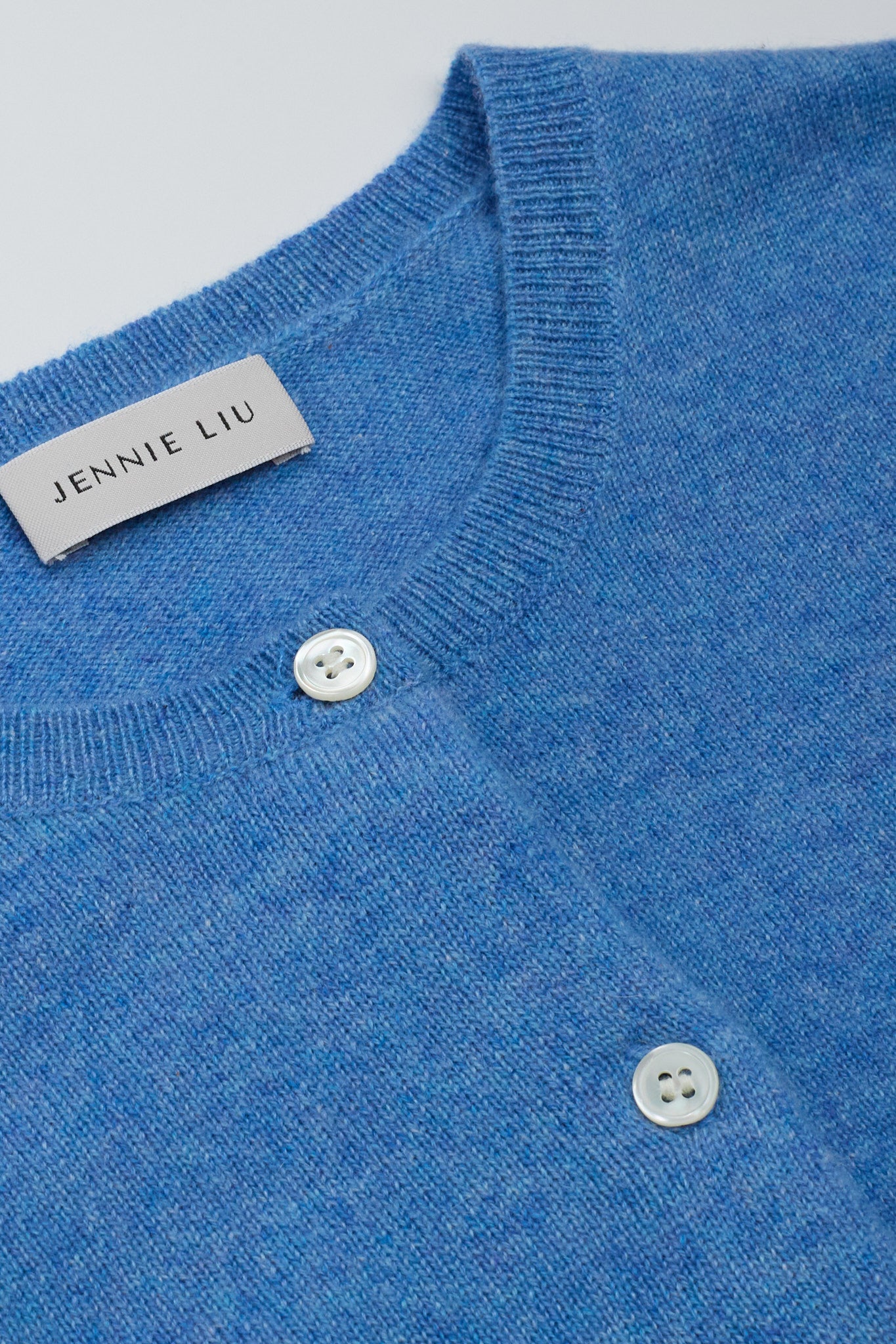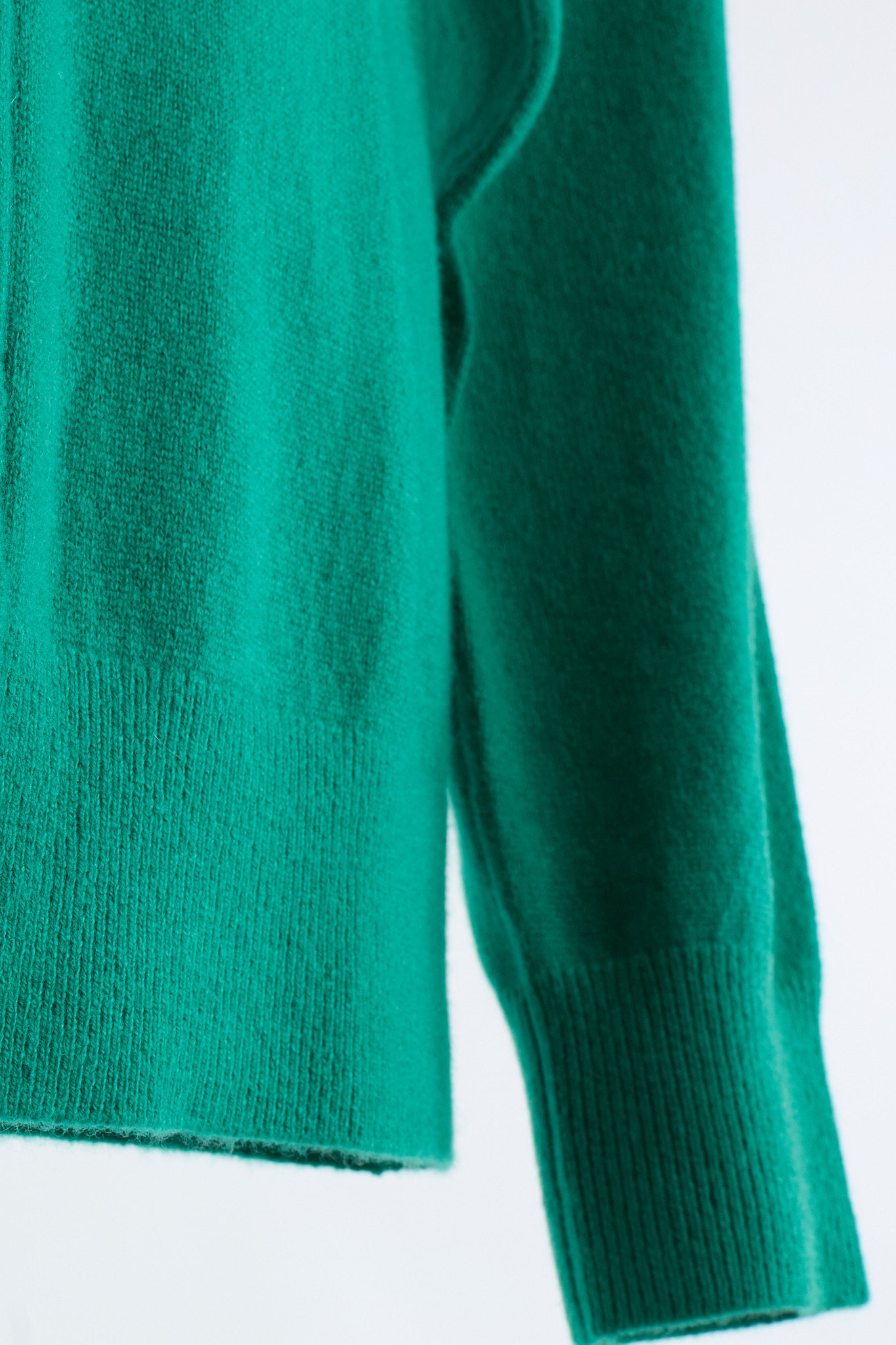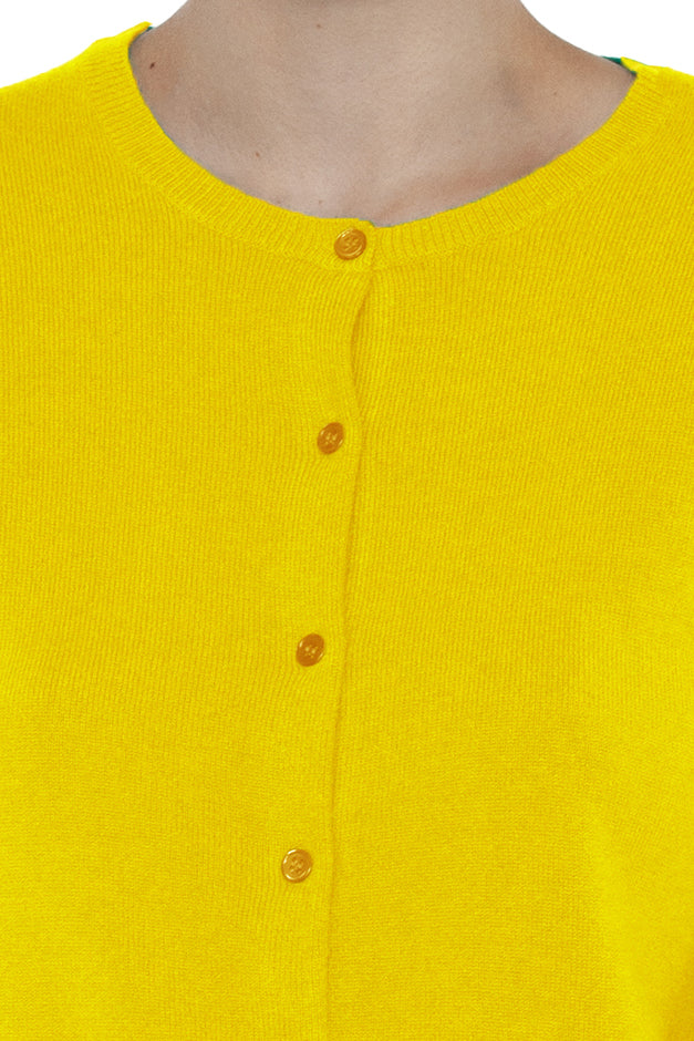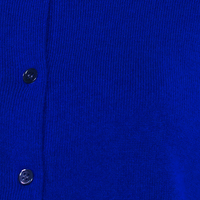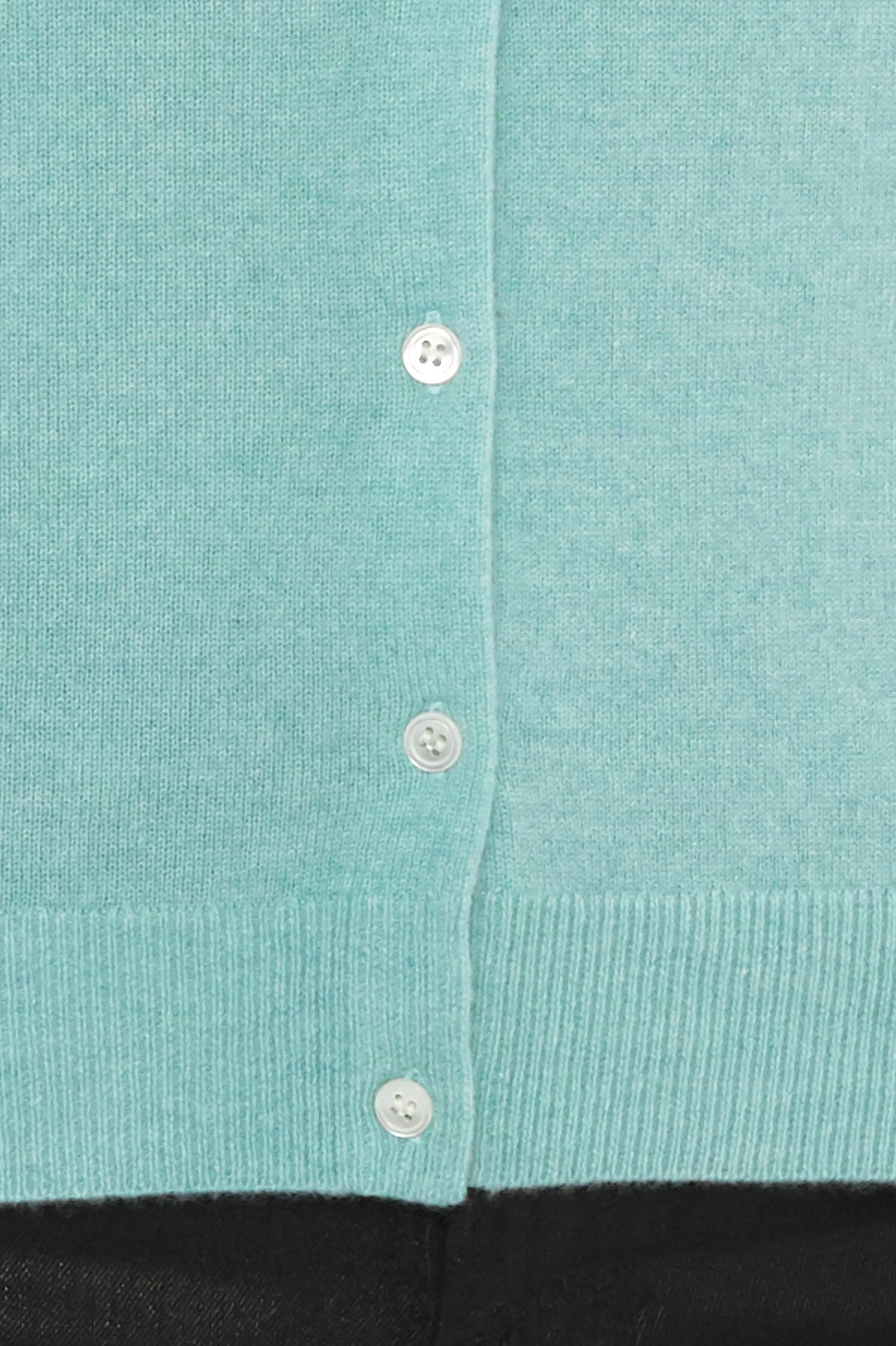 First quality premium cashmere cardigan sweater with shell button front closure on clean self-facing placket.