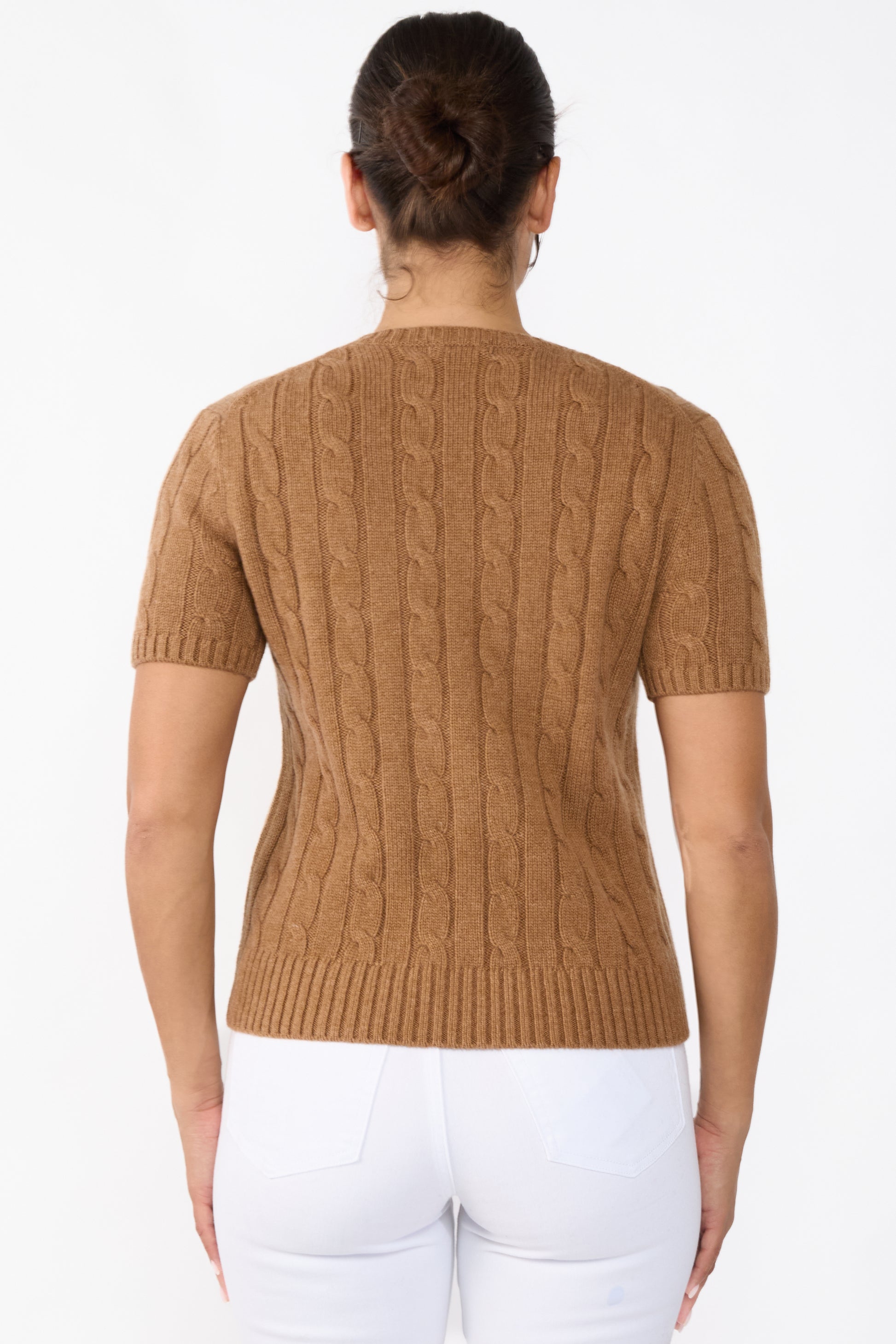 This Short Sleeve Wool Cashmere Cable-knit Crewneck Sweater is densely knitted with yarns gently spun from the latest Italian technology, it represents the ultimate pilling performance of its class, lightweight yet extremely cozy with superior soft hand.